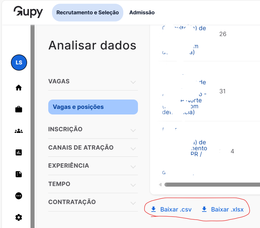 Bom dia, Eu estou tentando obter a informação de qual a etapa do candidato que está mais avançado em uma determinada vaga, através do site eu consigo chegar nesse dado pela aba de análises extraindo o relatório ao final da pagina, exibido nas imagem a seguir